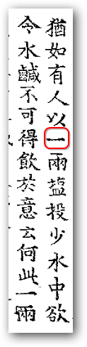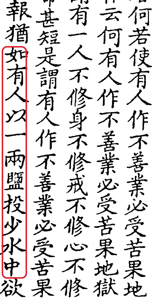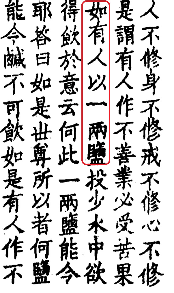 《中阿含11經,鹽喻經》卷3〈業相應品 2〉:「猶如有人以 兩鹽投少水中,欲令水鹹不可得飲。於意云何?此一兩鹽,能令少水鹹叵飲耶?」(CBETA, T01, no. 26, p. 433, a21-24)