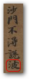 《惟教三昧(存卷下 前殘)》:「沙門不淂說波X有池水中有好香莘亦不淂念某X水中有好香莘當念心意化使作善是為沙」(CBETA 2019.Q1, D20, no. 8869, p. 4a9-11)
